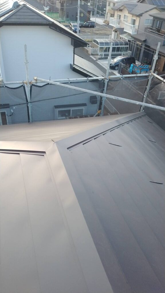 屋根の上に新しいガルバリウム鋼板製の屋根材を被せ、しっかりと固定。つなぎ目や取り合い部分の防水処理も念入りに行いました。