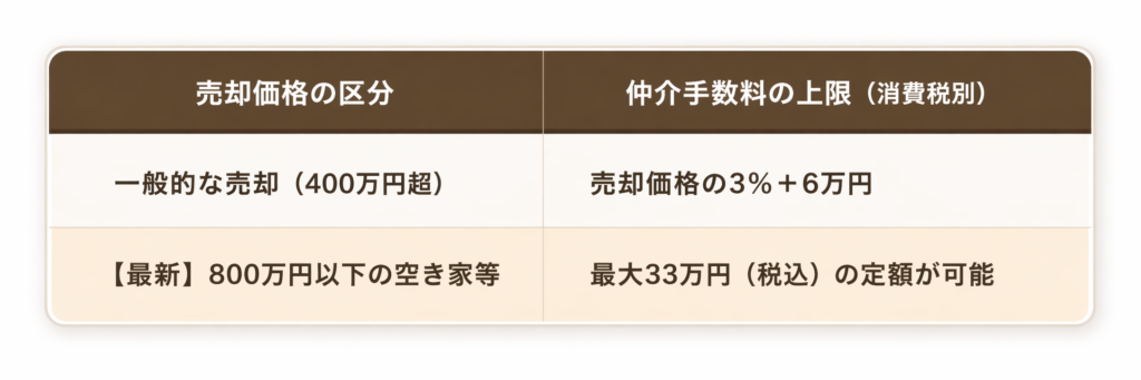 仲介手数料の上限は法律で決まっており、売却価格によって異なります。特に注目すべきは、2024年(令和6年)7月の法改正により、低価格な物件の特例が拡大された点です。